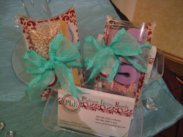 All the give-away boxes were acrylic pillow boxes. Gorgeous!! And the perfect shape for PLE's desire to fill them with Bridal spa and pampering goodies!